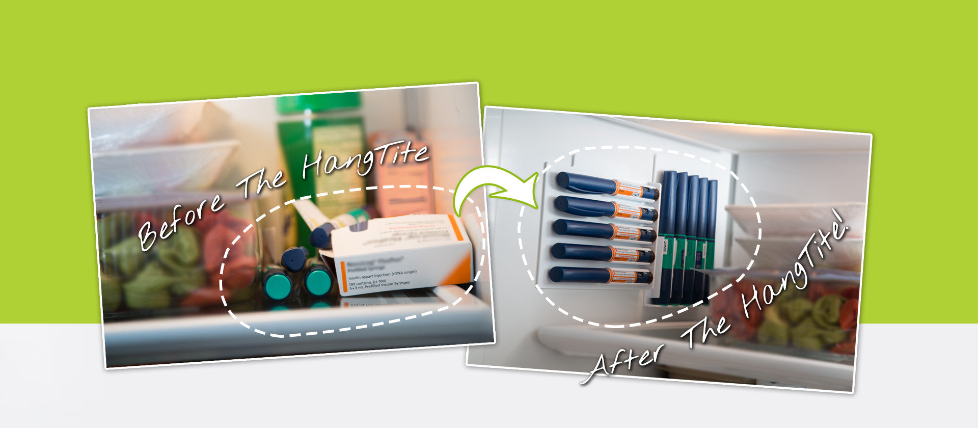 Hangtite makes for a much better storage solution for your insulin pens. Hangtite keeps your fridge tidy and your family happy!